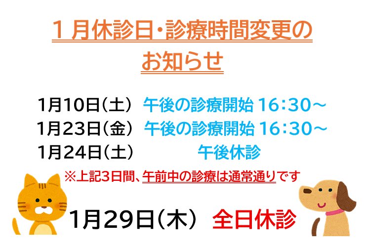 手術時間延長に伴い、1月10日(土)と1月23日(金)は午後の診療開始時間が16:30、1月24日(土)は午後休診となります。