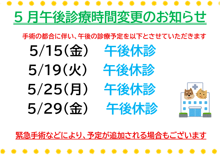 また、手術の都合により、5/15(金)、5/19(火)、5/25(月)、5/29(金)は午後休診となります。