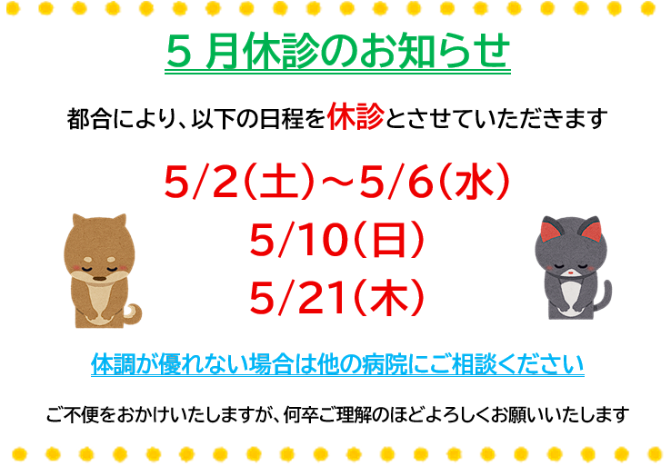 5月の休診日は、5/2(土)~5/6(水)と、5/10(日)5/21(木)となっております。