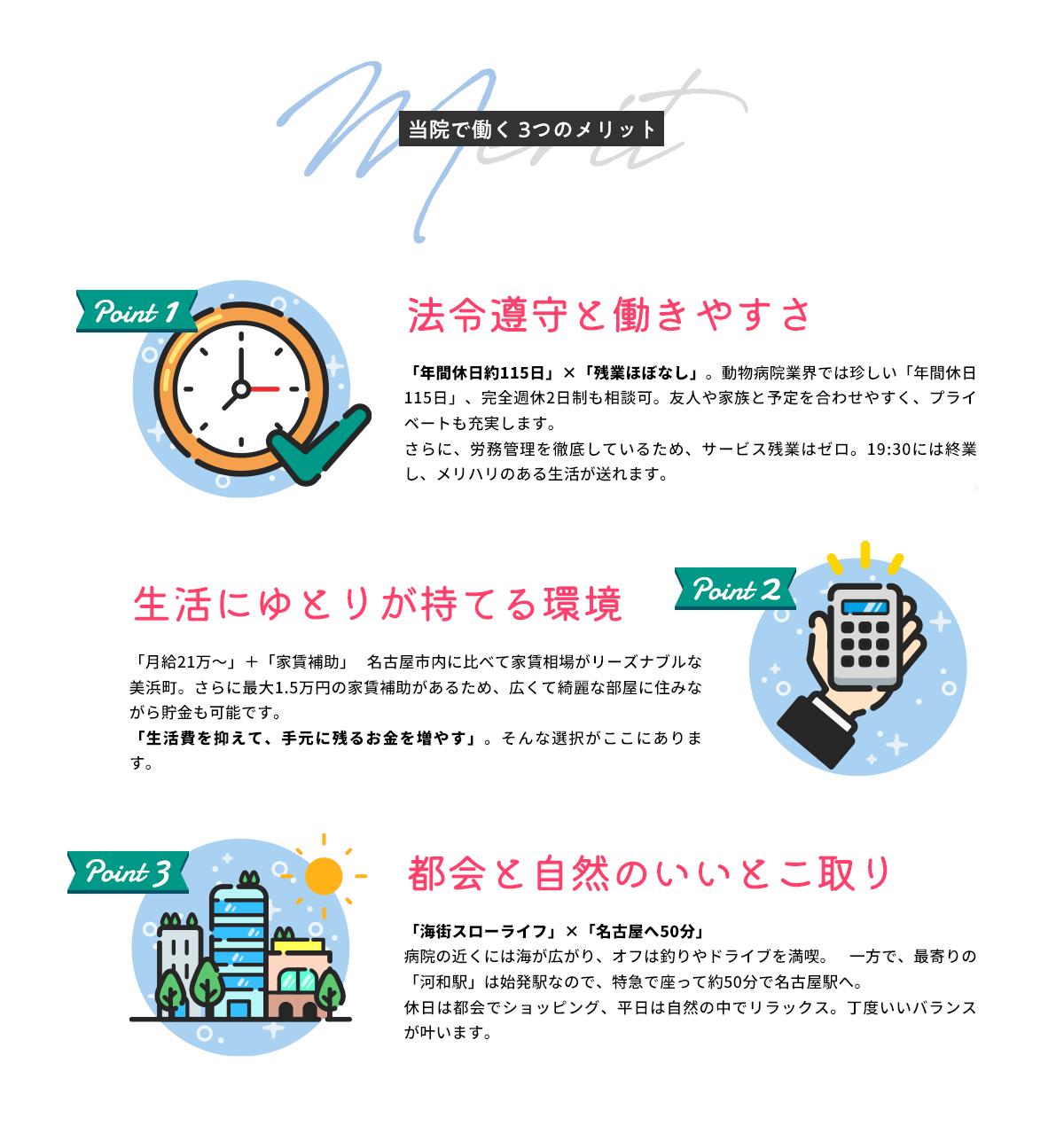 待遇家賃補助(最大1.5万円)、交通費支給、社保完備、引越し補助(応相談)、制服貸与、ペット診療費割引 ほか