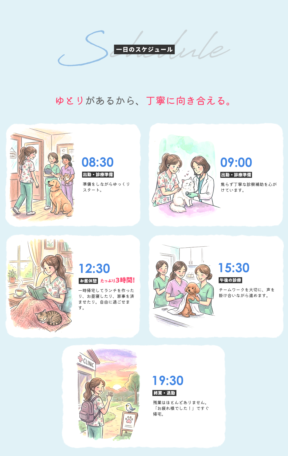 勤務時間08:30〜12:30 / 15:30〜19:30(実働8時間)